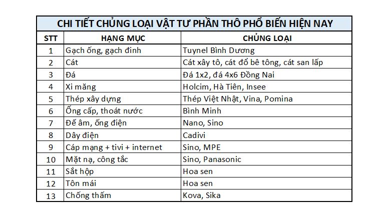 Danh sách này không đầy đủ vì có nhiều vật liệu khác cũng được sử dụng trong xây dựng, tùy thuộc vào từng loại công trình và yêu cầu kỹ thuật, tuy nhiên, đây là những vật liệu phổ biến và quan trọng trong xây dựng phần thô.