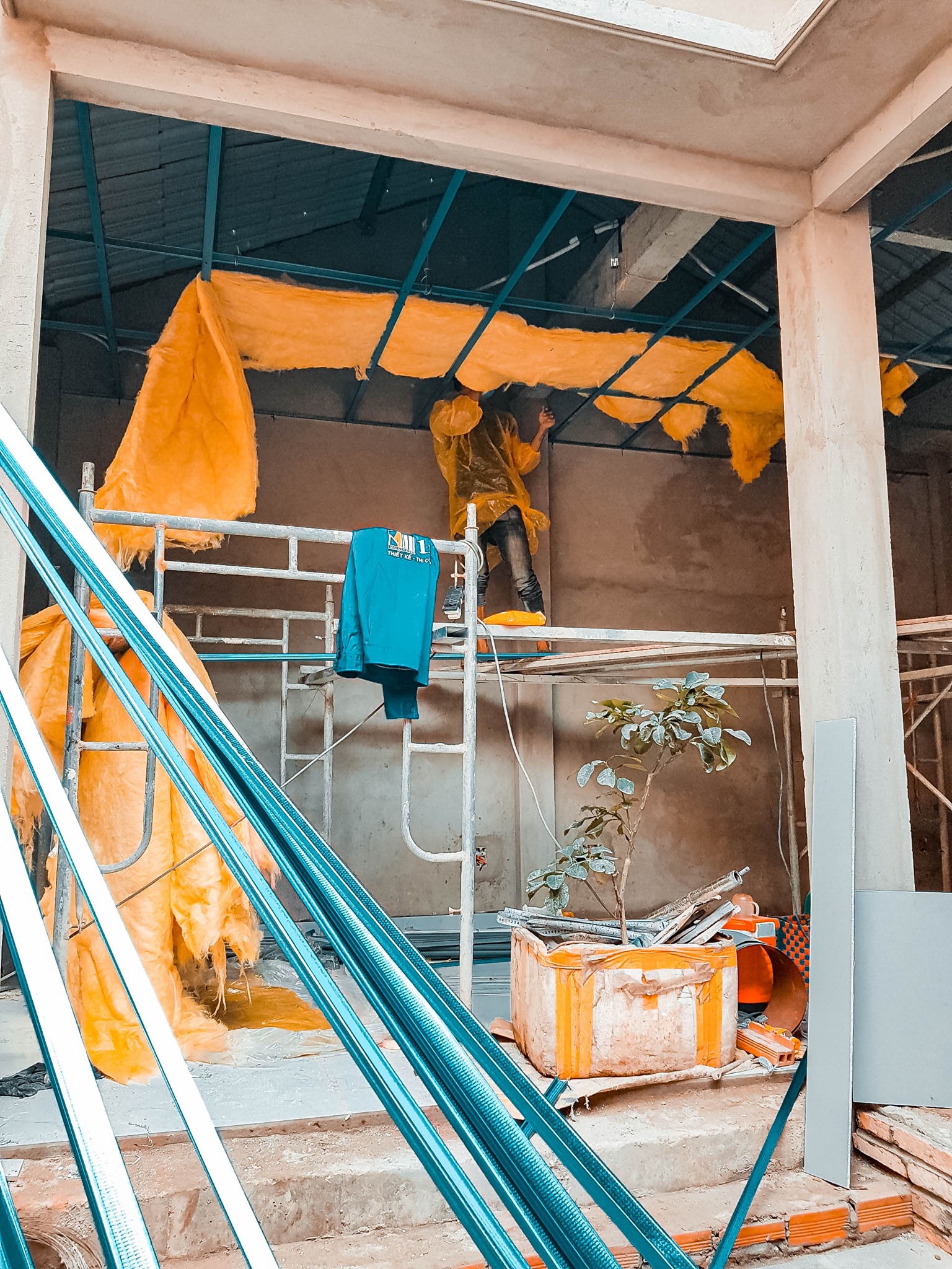 Công tác thi công bông thủy tinh cách nhiệt + cách âm cho trần thạch cao