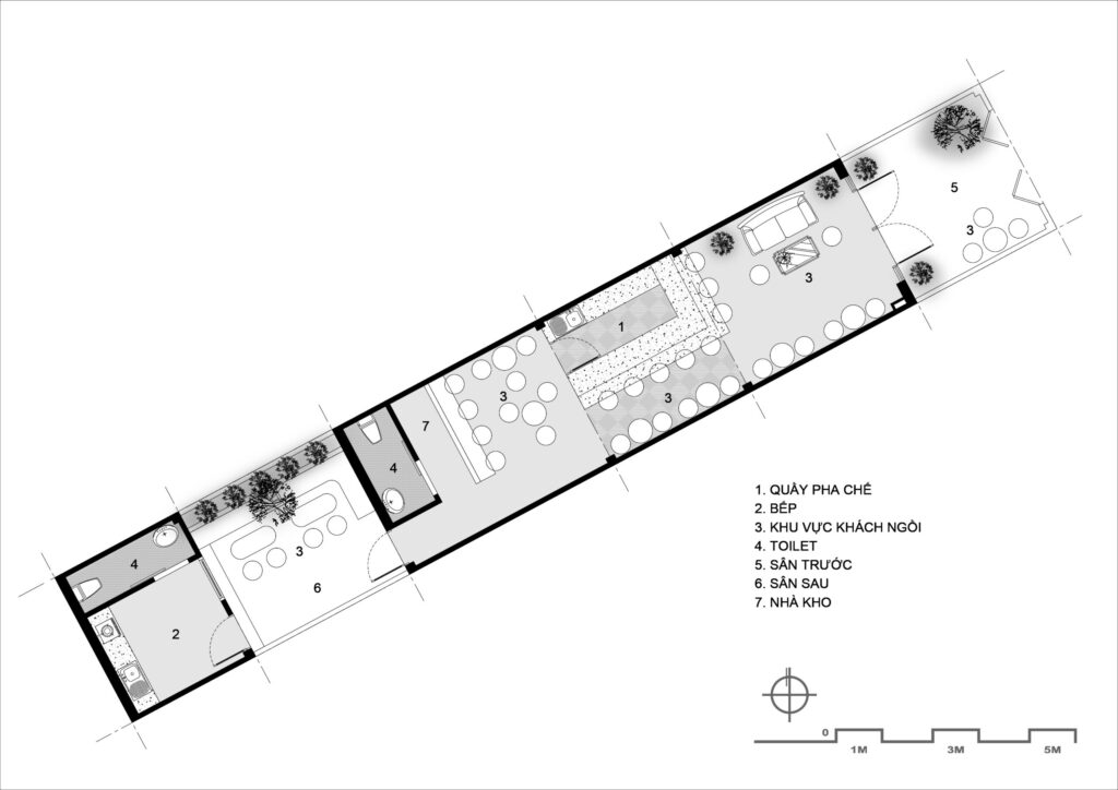 Quán còn có một không gian bếp nhỏ nằm phía cuối nhà, ngăn cách với không gian chính của quán bằng một khoảng sân rộng. Điều này giúp cho việc chế biến các món ăn nhẹ phục vụ cho khách hàng thuận tiện hơn, mà không bị bay mùi gây ảnh hưởng đến những vị khách khác.