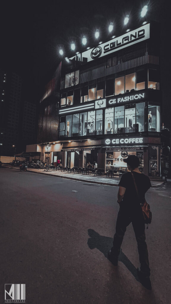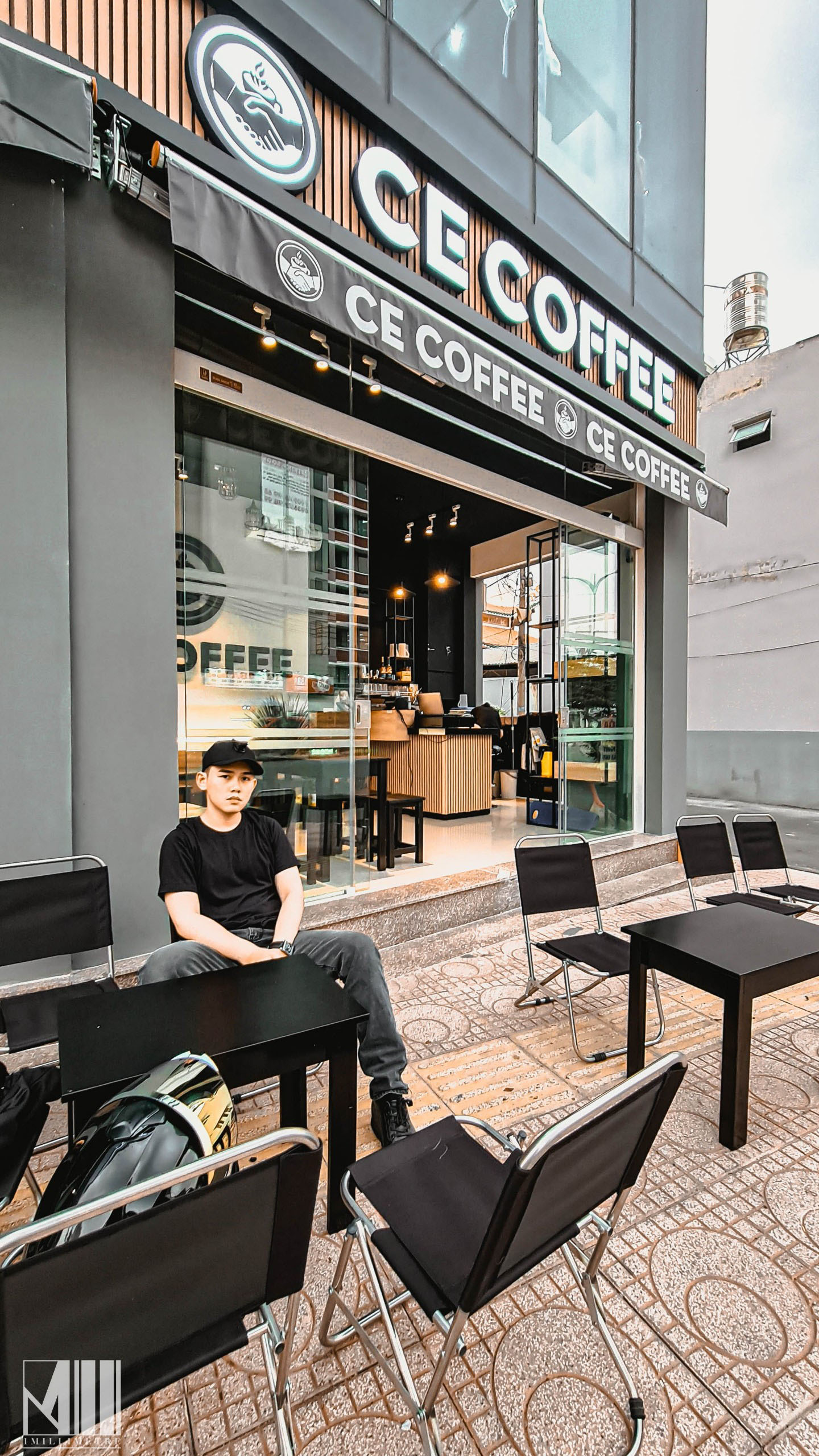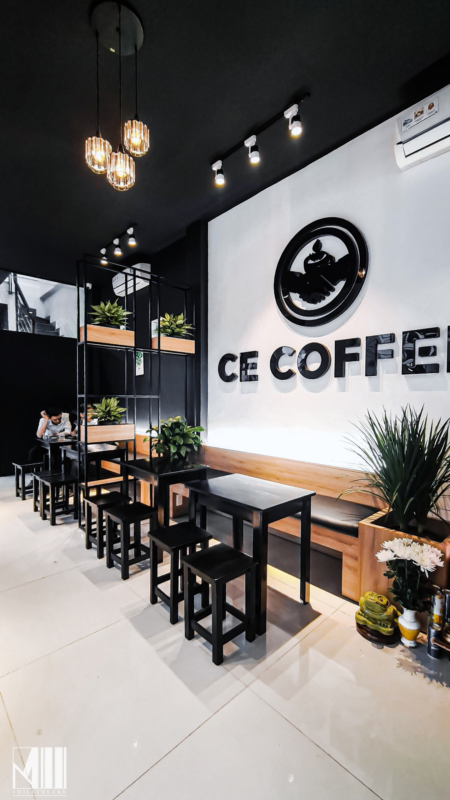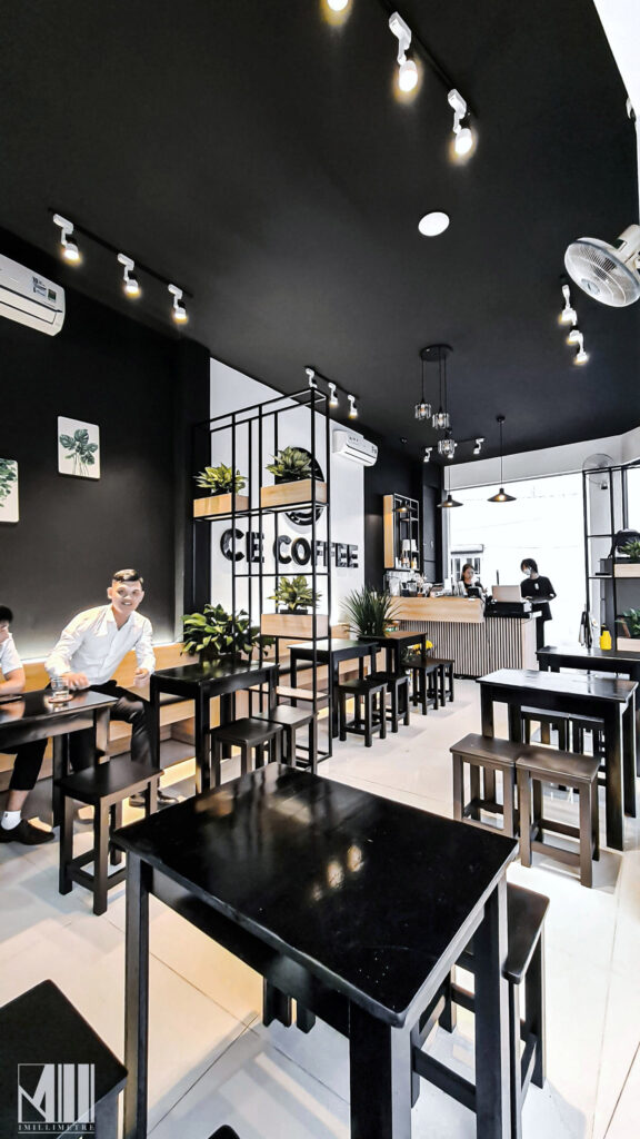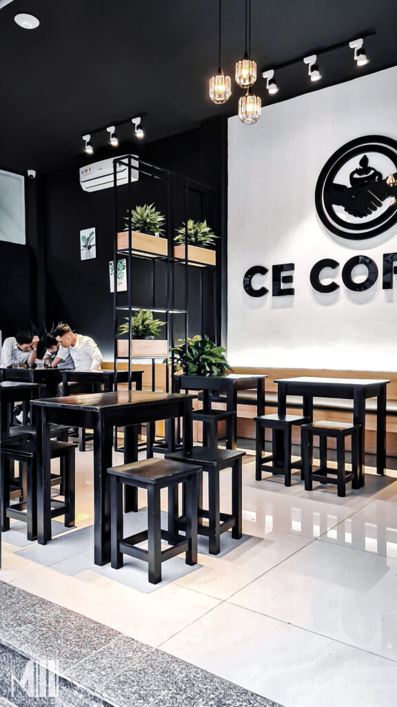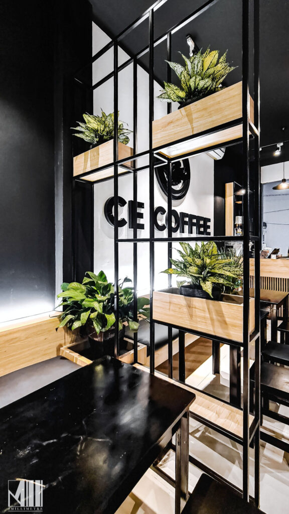 Tầng trệt của tòa nhà thiết kế dành riêng cho quán cafe CE Coffee. Quán cafe có không gian mở, mang lại sự thoải mái cho khách hàng khi thưởng thức đồ uống và trò chuyện với nhau. Quán được thiết kế với tông màu đen trắng gỗ, tạo cảm giác ấm cúng, thân mật. Ghế ở đây đa phần là kiểu ghế ngồi thấp, bố trí rải rác ở trong nhà và ngoài trời.