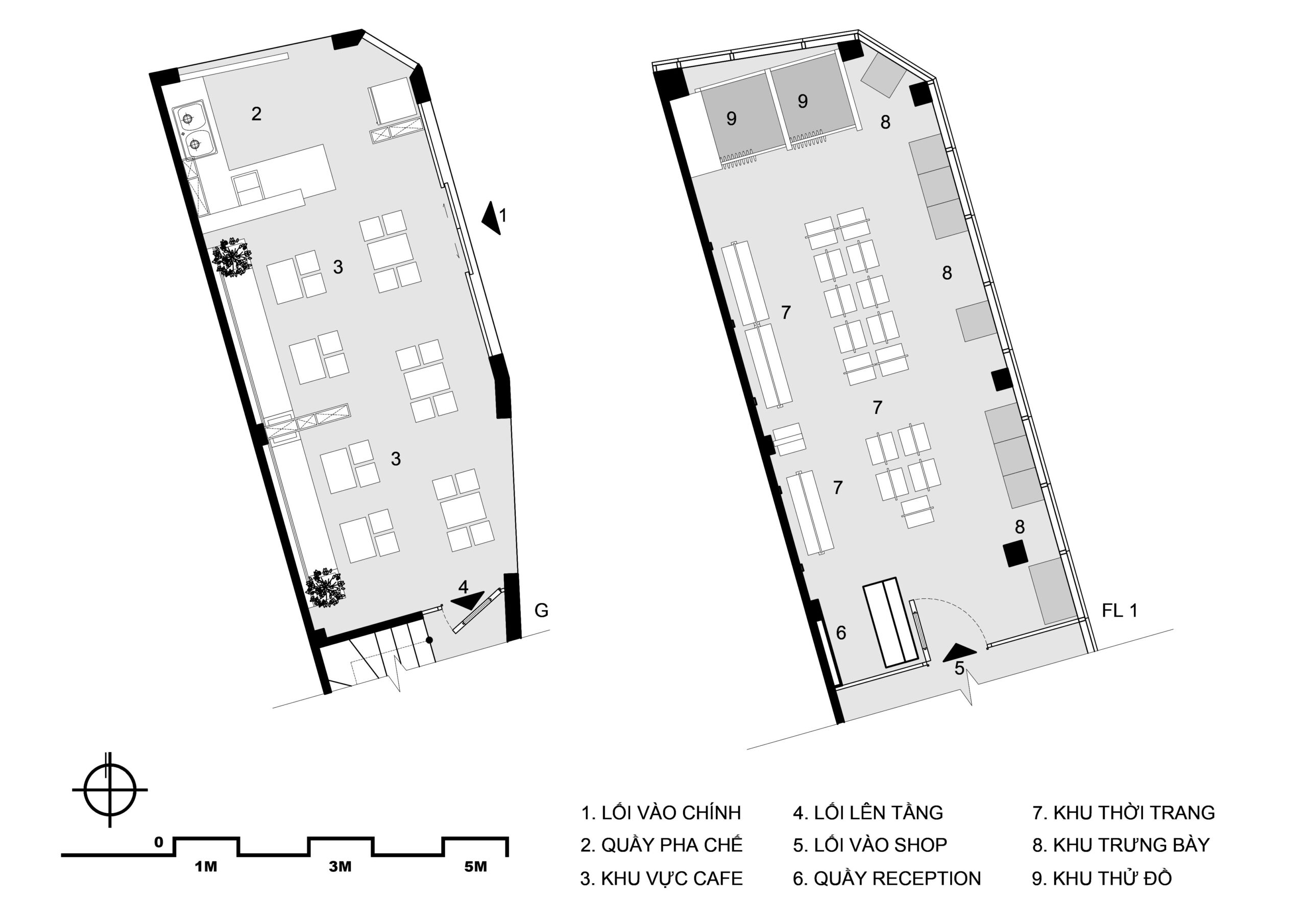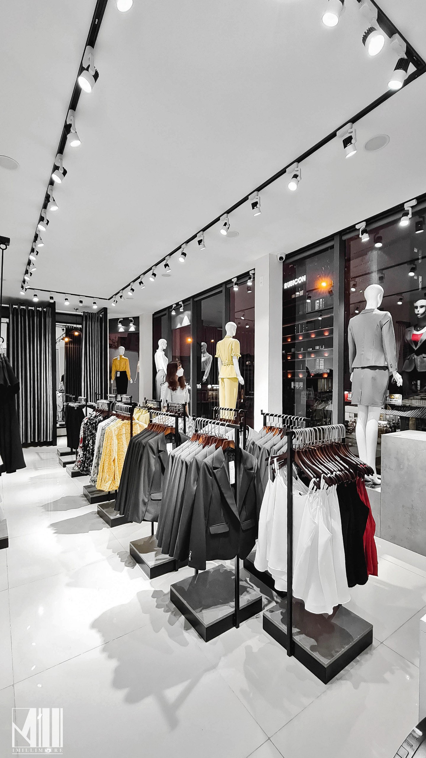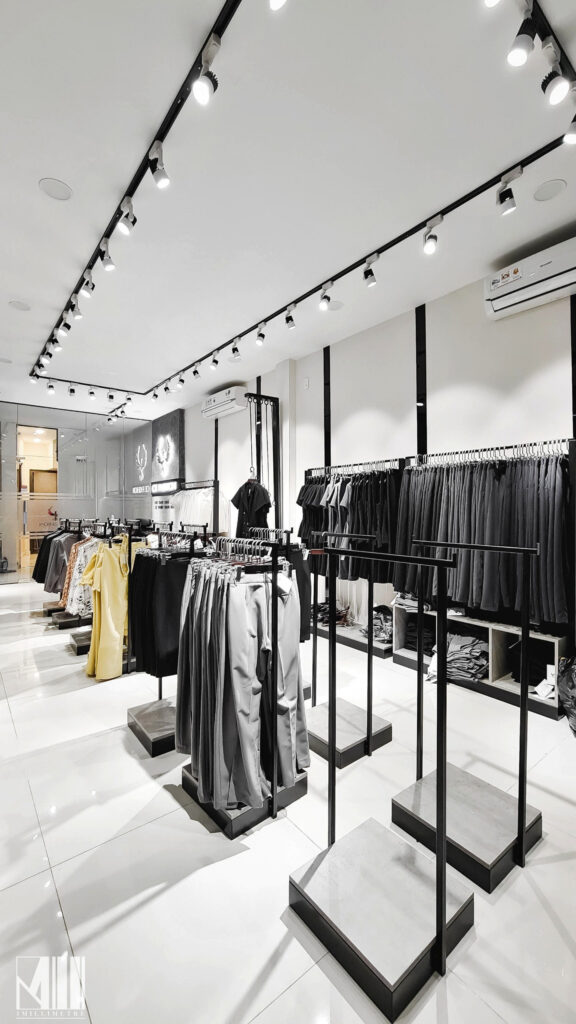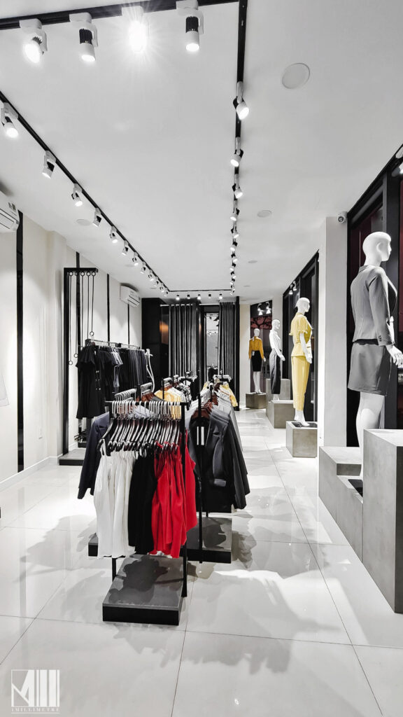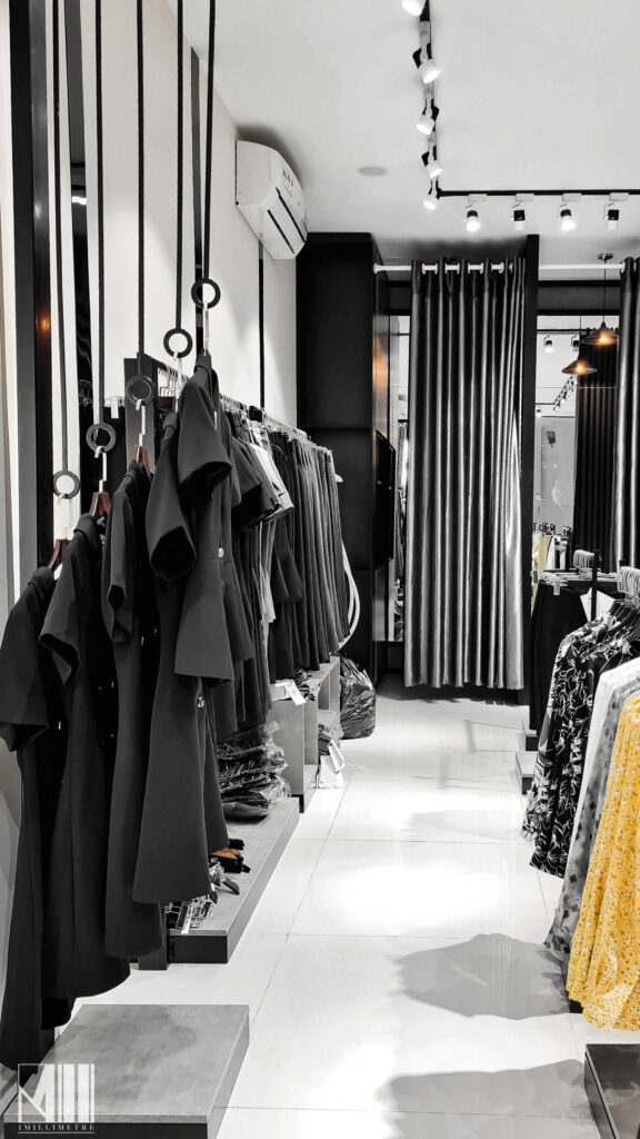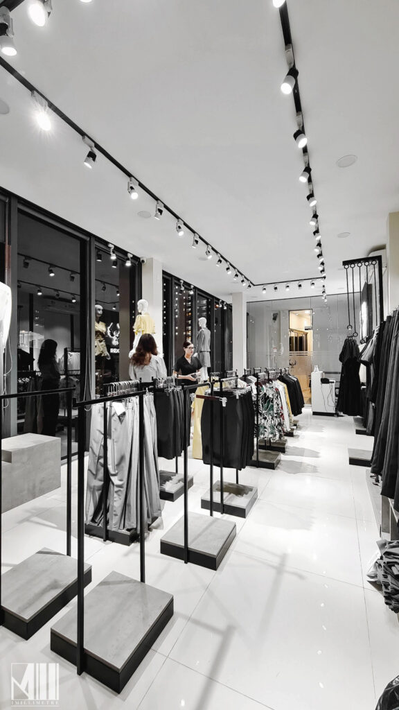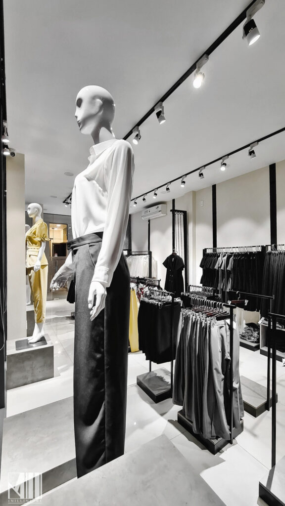 Cửa hàng bao gồm quầy thu ngân được bố trí ngay tại lối vào, phía cuối phòng là hai phòng thay đồ rộng rãi với hệ gương cao đụng trần, khu vực trưng bày các mẫu quần áo với các thiết kế mới. Ma-nơ-canh được đặt ngay tại các ô kính lớn để trưng bày ra những sản phẩm nhằm thu hút khách hàng đến xem và mua sắm, đặc biệt vô cùng nổi bật vào ban đêm.